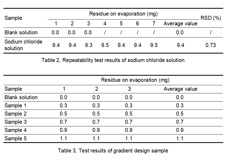 By adding a known amount of sodium chloride as a residue on evaporation to purified water, and simulating the residue on evaporation test of purified water with known results, the data accuracy and precision of the AUTO ZF3600 tester are verified. Empty cups were weighed at constant weight, and residues were weighed in 2 rounds. The difference between the constant weights was less than 0.3 mg. The repeatability test results of sodium chloride solution are shown in Table 2. The experimental results of the sodium chloride solution gradient design are shown in Table 3.