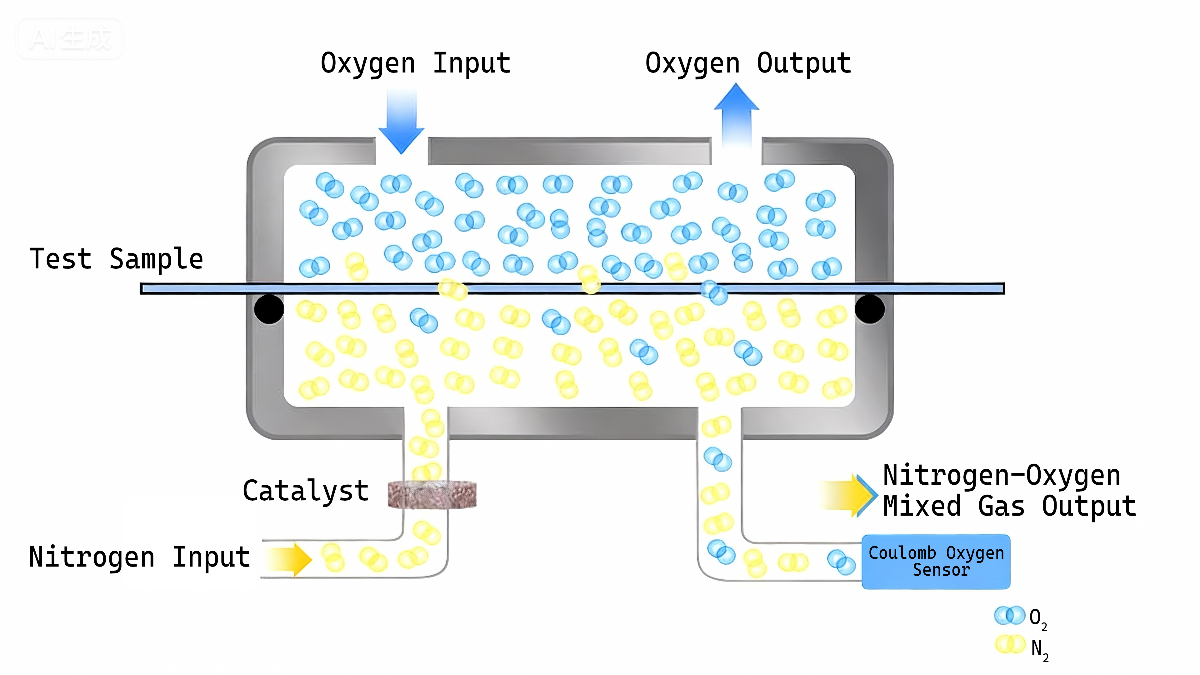Y110L oxygen transmission rate tester adopts the principle of coulombic electricity method. The pre-treated specimen is fixed in the middle of the test chamber, high purity oxygen flows in the upper chamber of the film, high purity nitrogen (carrier gas) flows in the lower chamber, oxygen molecules diffuse through the film to the nitrogen gas on the other side and are carried to the sensor by the flowing nitrogen gas, and the oxygen transmission rate is calculated by analyzing the oxygen concentration measured by the sensor.